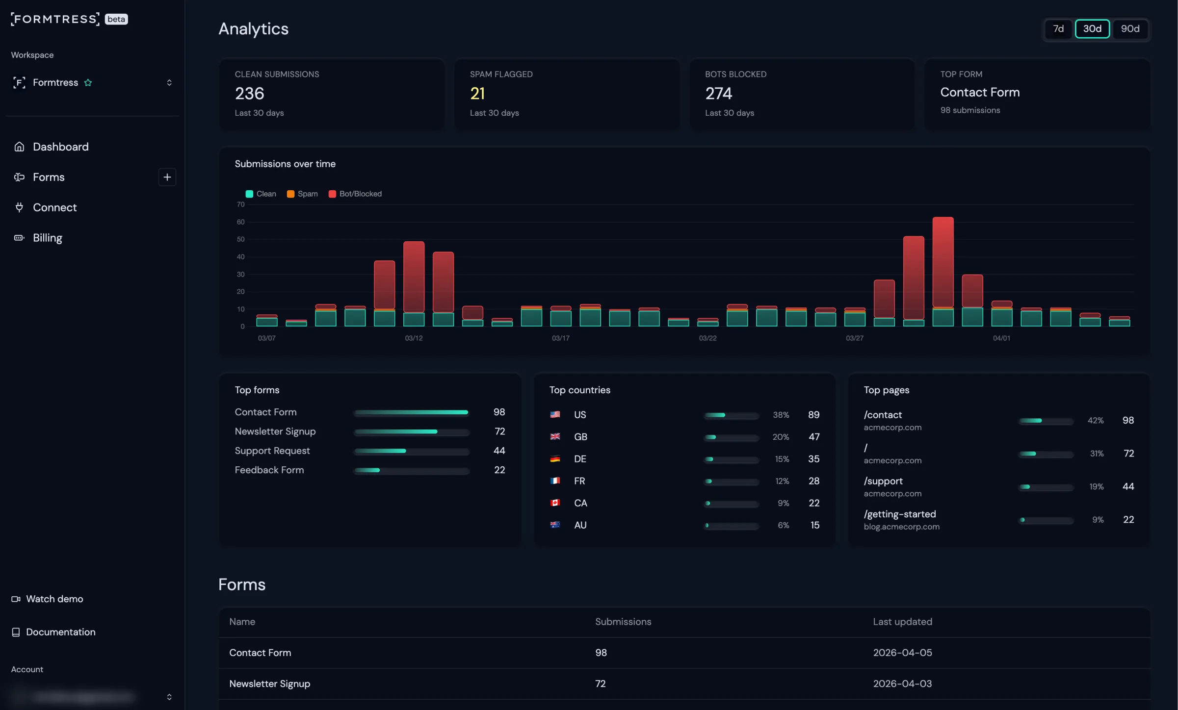 Formtress is built to scale automatically — each submission is processed independently, so there's no single point of failure to overwhelm. Rate limiting is in place to protect your endpoints from abuse, but legitimate traffic is handled normally no matter how much volume you receive.